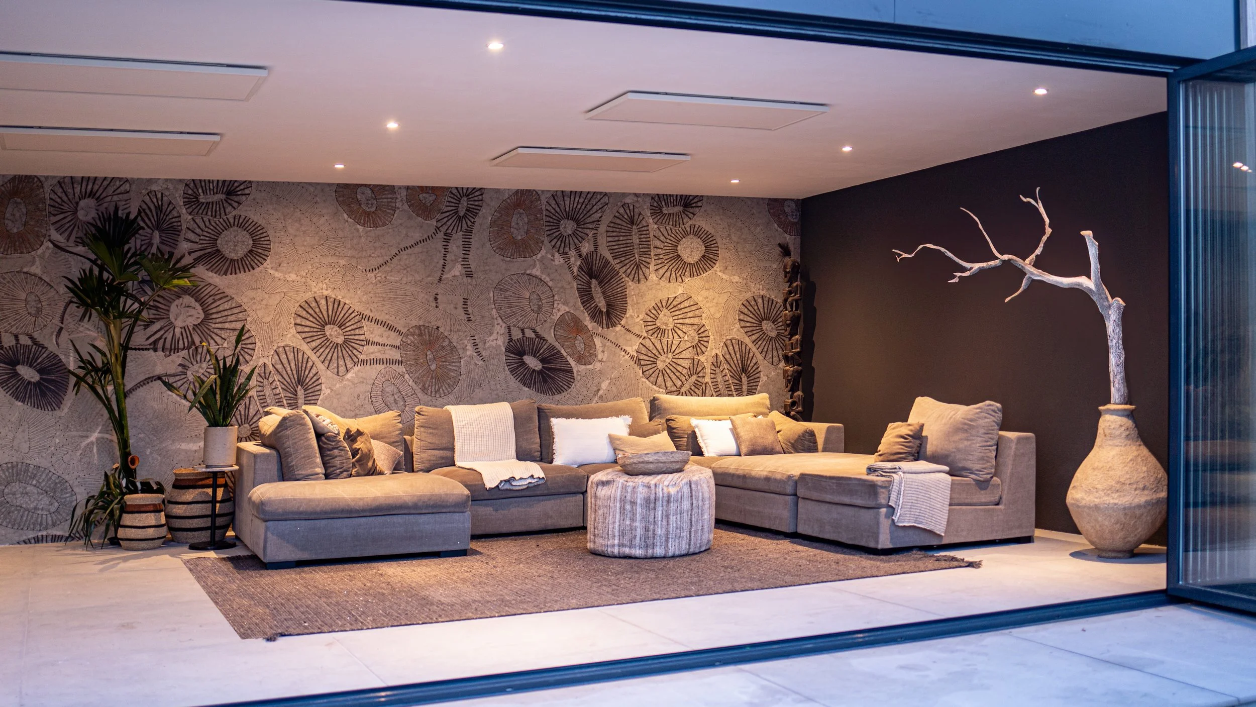 Nu de harmonica deuren geopend zijn, ontstaat een gevoel van ruime openheid en verbondenheid met de omgeving. Voor de koelere momenten kunnen de warmtepanelen in het plafond eenvoudig worden ingeschakeld, waardoor een aangename, comfortabele sfeer wordt gecreëerd. Zo combineert de unit een ruimtelijk gevoel met behaaglijke warmte, perfect voor elk seizoen.
