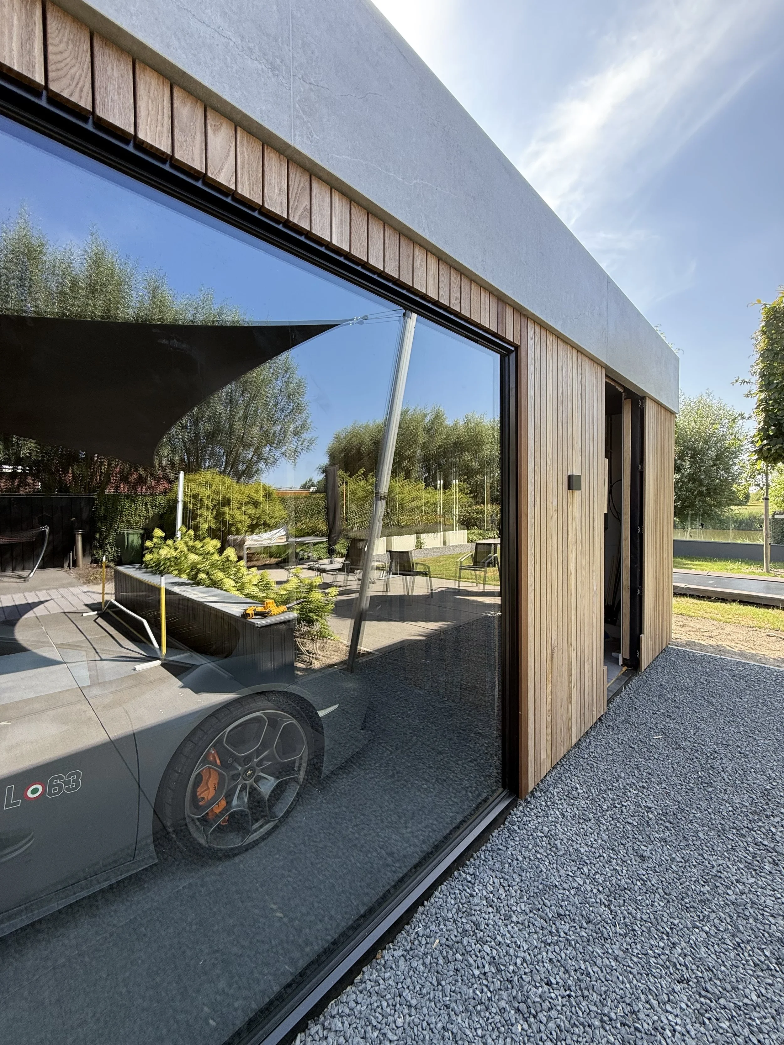 De buitenafwerking van dit project is met veel zorg en oog voor detail gerealiseerd. Als stijlvolle en slijtvaste bekleding is de koof uitgevoerd in Dekton, een innovatief materiaal dat bekendstaat om zijn sterkte, weerbestendigheid en luxueuze uitstraling. Voor een harmonieus geheel zijn dezelfde houten latten die binnen zijn toegepast ook buiten doorgevoerd, waardoor binnen en buiten naadloos met elkaar verbonden worden.